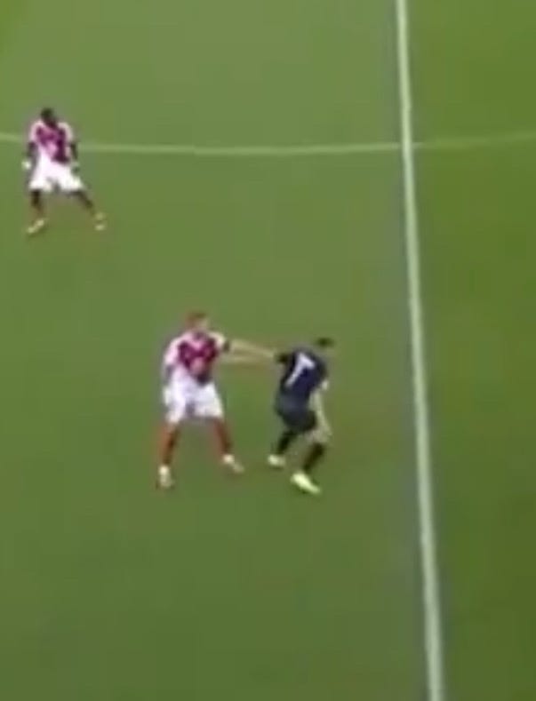 • Left arm extended towards Dier to create separation or to gauge the distance between himself and Dier in preparation for potential contact.